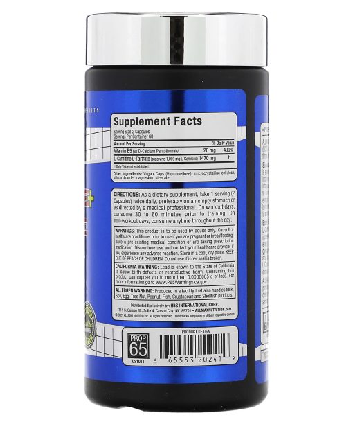Science – Innovation – Quality – ResultsAids in Muscle Recovery and Reduces Muscle Tissue DamageHelps Improve Physical Performance and Tissue FormationIncreases Metabolism of Fats (Supports Body Fat Reduction)Vegan Caps™Dietary SupplementPurity & Potency Tested – Quality GuaranteeProfessional Grade SupplementsLab Tested, Every LotcGMP Registered FacilityGluten Free TestedAllmax introduces L-Carnitine L-Tartrate (LCLT), one of the world’s most bio-available forms of L-Carnitine supplementation.Stimulant-Free Fat Metabolizer: L-Carnitine is essential for transporting long-chain fats into the cell (mitochondria). L-Carnitine taps into your fat supply and may provide support to burn it as fuel, resulting in increased energy. Without L-Carnitine, these fats cannot be burned for energy and are instead shunted to stored body fat.Boost Energy, Endurance & Performance: L-Carnitine enhances performance by increasing the body’s reliance on fat for energy; this reduces depletion of muscle glycogen. By reducing muscle tissue lactic acid build-up, performance athletes using L-Carnitine can extend duration of muscular exertion before fatigue.Allmax L-Carnitine L-Tartrate (LCLT) provides 60 full servings per bottle while delivering 1,000 mg of L-Carnitine in each serving.