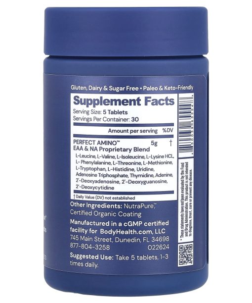 Coated TabletsEssential Amino Acids Optimized for Maximum UtilizationContains Nucleic Acid Building Blocks The True Science of ProteinVegan Dietary SupplementGluten, Dairy & Sugar FreePaleo & Keto Friendly Build Lean Muscle Boost Performance Speed RecoveryPerfect Amino™ dietary supplement is utilized up to 99% to help build new protein, muscle & collagen without the caloric impact & without breaking a fast. It is supplemented with Nucleic Acid building blocks to help direct the process of Protein Synthesis.5 tablets provides 5 grams with utilization comparable to dietary protein consumption of (on average):29 g – whey, soy, dairy, nuts15 g – meat, poultry, fish10 g – eggs