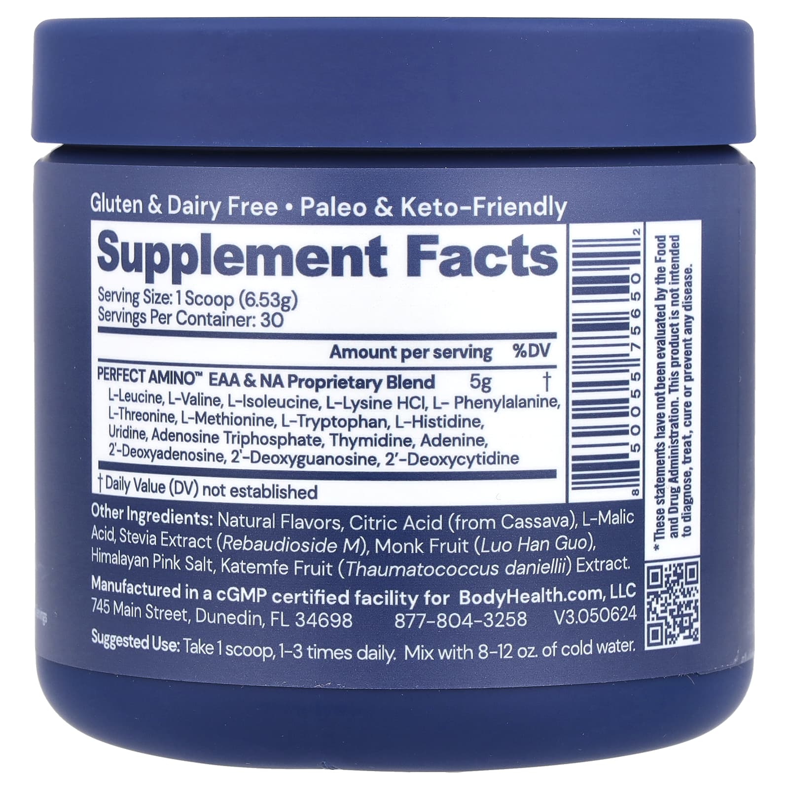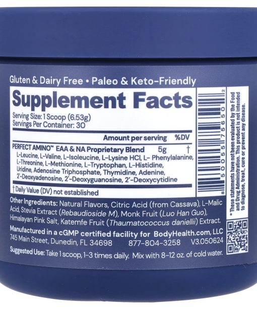 Essential Amino AcidsOptimized for Maximum UtilizationContains Nucleic Acid Building BlocksThe True Science of ProteinVegan Dietary SupplementGluten & Dairy FreePaleo & Keto-FriendlyBuild Lean MuscleBoost PerformanceSpeed RecoveryPerfect Amino™ dietary supplement is utilized up to 99% to help build new protein, muscle & collagen without the caloric impact & without breaking a fast. It is supplemented with Nucleic Acid building blocks to help direct the process of Protein Synthesis.1 scoop provides 5 grams with utilization comparable to dietary protein consumption of (on average):29 g whey · soy · dairy · nuts10 g eggs15 g meat · poultry · fish