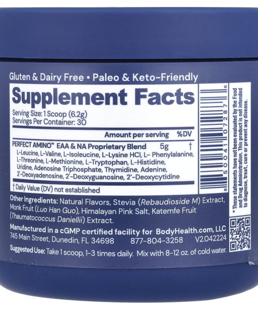 Essential Amino AcidsOptimized for Maximum UtilizationContains Nucleic Acid Building BlocksThe True Science of ProteinVegan Dietary SupplementGluten & Dairy FreePaleo & Keto-FriendlyBuild Lean MuscleBoost PerformanceSpeed RecoveryPerfect Amino™ dietary supplement is utilized up to 99% to help build new protein, muscle & collagen without the caloric impact & without breaking a fast. It is supplemented with Nucleic Acid building blocks to help direct the process of Protein Synthesis.1 scoop provides 5 grams with utilization comparable to dietary protein consumption of (on average):29 g whey · soy · dairy · nuts10 g eggs15 g meat · poultry · fish