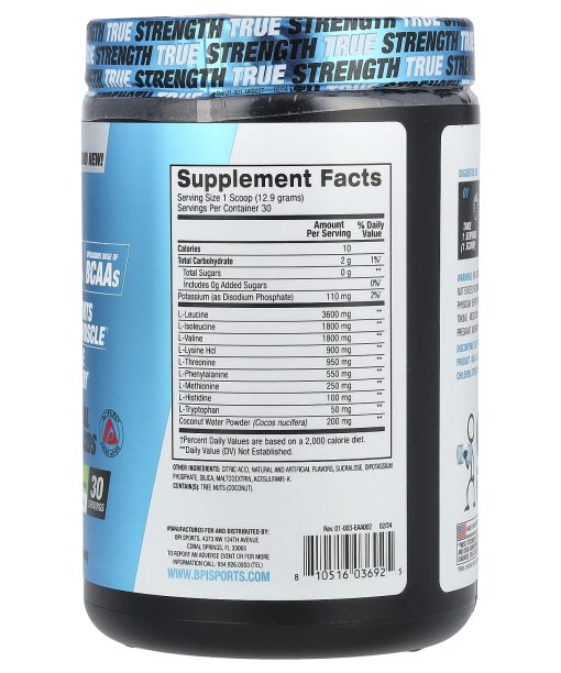 True Strength10 g EAAsEfficacious Dose of BCAAsSupports Lean Muscle†Muscle Recovery†Essential Amino AcidsAjipure® Amino AcidsNatural and Artificial FlavorsNo Artificial ColorsDietary SupplementcGMP – Quality Verified Good Manufacturing PracticesLifting hard is only one piece of the puzzle. Recovery is one of the most important parts of a successful training session. That’s where our EAA’s come in. Taken before, during, or after your workout, our aminos are formulated to repair and replenish your muscles and keep you pushing harder and longer. We also include Coconut Water Powder to aid your body in hydration, leading to a better overall workout. Jump start your recovery process, and reach your goals faster.†When combined with a proper exercise and nutrition regimen.