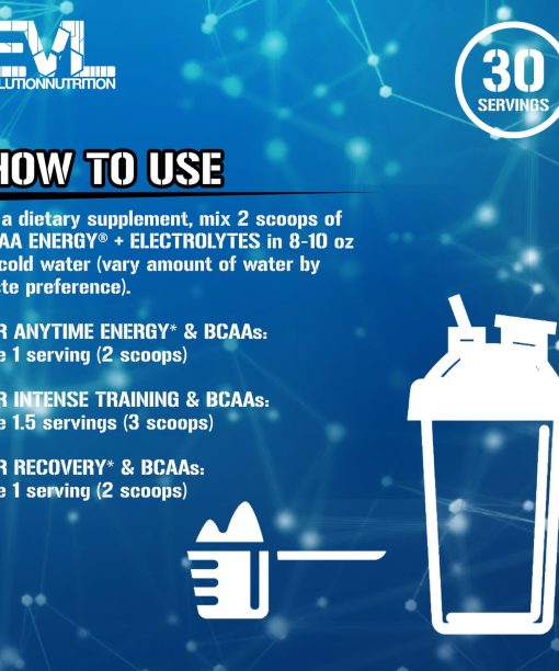 As dietary supplement mix 2 scoops of BCAA Energy® + Electrolytes in 8-10 oz of cold water (vary amount of water by taste preference).For Anytime Energy & BCAAs:  Use 1 serving (2 scoops).For Intense Training & BCAAs:  Use 1.5 servings (3 scoops).For Recovery & BCAAs:  Use 1 serving (2 scoops).OccasionAnytime EnergyIntense TrainingRecoveryNumber Of Scoops2 scoops3 scoops2 scoopsBCAA Level5 g7.5 g5 gTotal Aminos6.5 g9.75 g6.5 gNatural Energizers110 mg165 mg110 mg