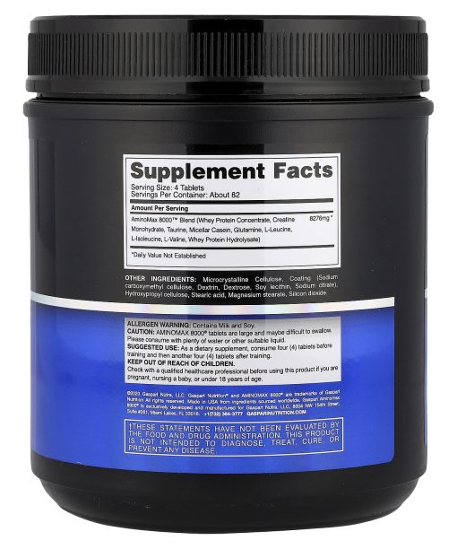 Super High PerformanceDesigned for Advanced Athletes and BodybuildersEnhanced with Creatine, Taurine and BCAA’sPromotes Size, Strength & Endurance IncreasesWith Meals | Pre | During | Post | Between Meals Dietary SupplementAbout 82 Servings8 Grams of Amino AcidsFortified with Creatine & L-Taurine Increased Size, Strength, and RecoveryAnti-Catabolic Properties Prevent Muscle BreakdownSupports Gains in Lean Muscle Mass, Stamina & StrengthGMP – Good Manufacturing Practice Certified AMINOMAX 8000® is the world’s leading amino-acid product in tablet form and has become the defacto standard for all products in this category. Gaspari Nutrition® created the ultimate product loaded with 8 grams of amino acids specifically formulated to boost glycogen intake resulting in increased lean muscle size, strength and endurance. AminoMax 8000® also acts as a powerful anti-catabolic agent, preserving your muscle gains and keeping your body in a positive nitrogen balance for optimal muscle growth and development. AMINOMAX 8000® is simply the best product in its class, often imitated, but never duplicated.