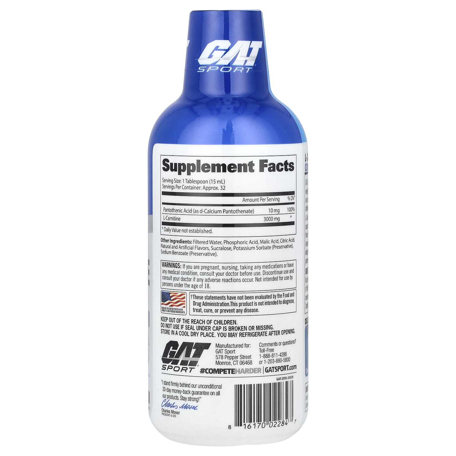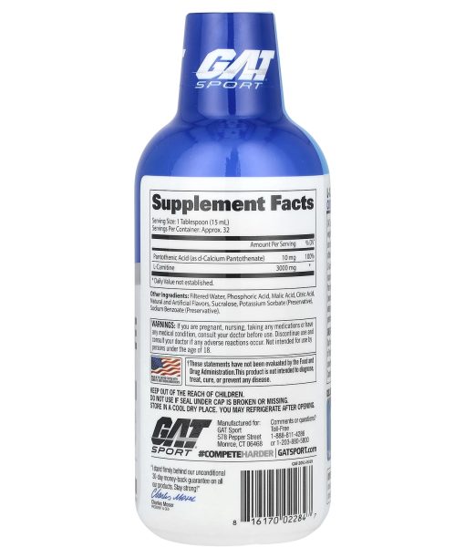 EssentialsHelps Convert Fat to EnergyImproves Athletic PerformanceSupports Endurance ExerciseSatisfaction Guaranteed – GAT AuthenticDietary SupplementNaturally and Artificially FlavoredNo Artificial ColorsNo DairyNo SoyNo YeastNo CarbsNo SugarGAT Liquid L-Carnitine 3000 is perfect for sport enthusiasts, weightlifters, athletes and anyone trying to improve their fitness and conditioning. It’s one of the most versatile supplements athletes can utilize.L-Carnitine helps the body convert food to energy, providing support for endurance exercise (aerobic) and during recovery from high intensity activities such as weightlifting and sprinting (anaerobic). For Carnitine to be most effective at fat burning, eating adequate levels of Omega-3 fatty acids may help athletic performance improvement when combined with carbohydrates.Great Absorption with Pantothenic AcidOur formula is further enhanced with a high potency dosage of Pantothenic Acid (Vitamin B5). Once Pantothenic Acid is converted into Coenzyme A in the body, it works directly with Carnitine to convert food to energy, providing synergistic support.Delicious Tasting! 1 Serving = 1 Tablespoon