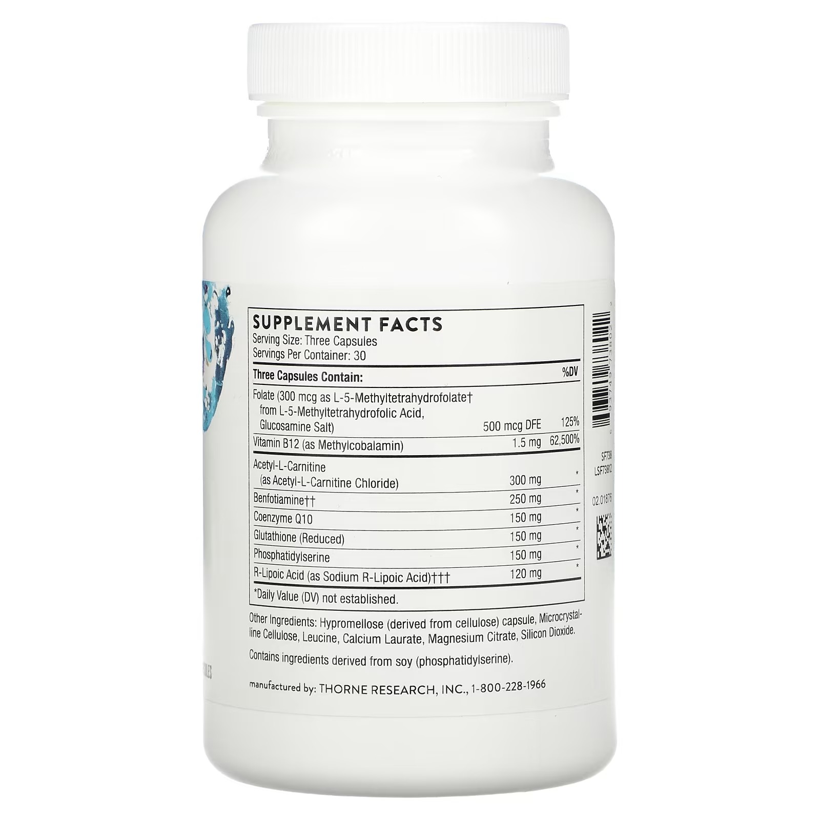 Neurochondria was one of the first comprehensive neurological support formulations of its kind in the supplement market. Antioxidant protection for sensitive neuronal tissue is provided by R-lipoic acid and glutathione. Enhanced neurotransmitter synthesis is supported by acetyl-L-carnitine. Optimal mitochondrial energetics are supported by coenzyme Q10. Cell membranes are supported by phosphatidylserine, and enhanced nerve cell function is supported by benfotiamine, 5-MTHF, and methylcobalamin.