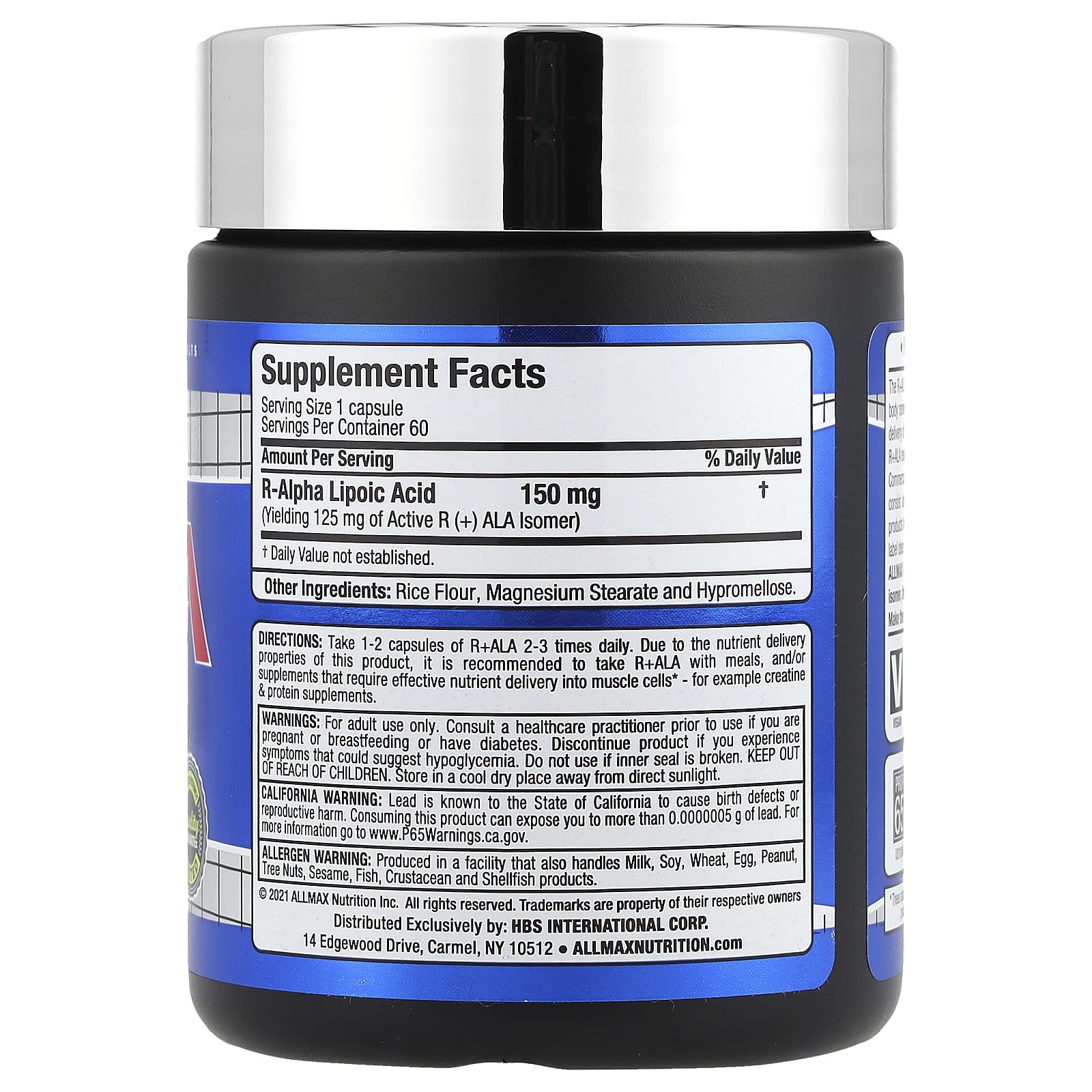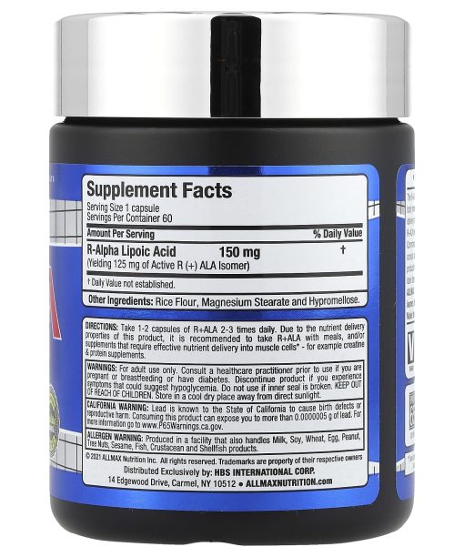 Science – Innovation – Quality – ResultsIncreases Nutrient DeliveryDeactivates Cell Damaging Free-RadicalsOptimizes Insulin ActivityVegan Caps™Quality Guarantee – Purity & Potency TestedDietary SupplementVegancGMP Registered FacilityEvery Lot Lab TestedProfessional Grade SupplementsThe R+ALA version of ALA is the purest form of Alpha Lipoic Acid. R+ALA helps the body remove sugar from the bloodstream and has an impressive ability to aid in the delivery of a wide variety of other nutrients, including creatine. Many people using R+ALA report higher energy levels for sustained periods of time. Commercially available ALA products on the market today tend to be cheaper and consist almost entirely of the S(-) isomer of Alpha Lipoic Acid. These inferior products have significantly weaker nutrient delivery and antioxidant properties. If a label does not specify R+ALA, it isn’t. ALLMAX R+ALA contains a full 125 mg of the pure biologically active R+ isomer, the mitochondrial form found naturally in the human body. Make the switch to the purest most bio-active ALA, ALLMAX R+ALA.