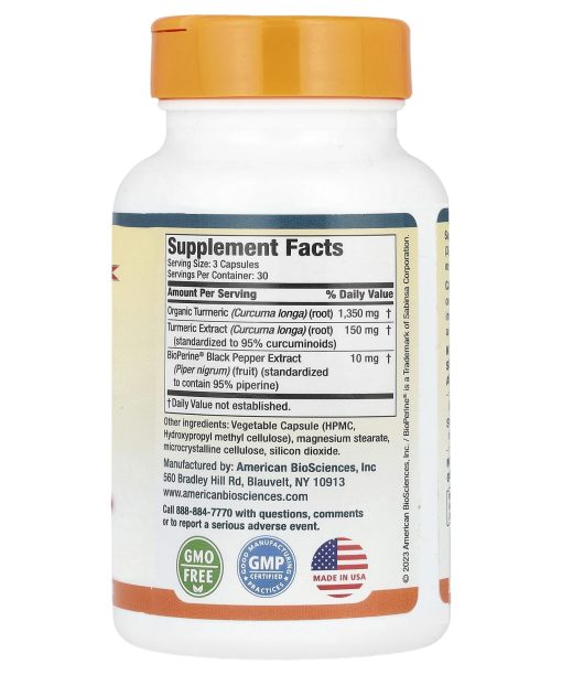 Nature & Science for Better HealthWith Bioperine® for Enhanced AbsorptionPure USA Grown TurmericPremium 95% Curcumin ExtractSupports Heart, Brain and Joint HealthSoothes and Comforts1,500 mg Per ServingDietary SupplementGMO FreeGMP Certified – Good Manufacturing PracticesGluten Free Ingredients3rd Party CertifiedEach serving of American BioSciences USA Premium Turmeric Curcumin contains 1500 mg of turmeric and 10 mg of BioPerine Black Pepper Extract standardized to contain 95% piperine, which supports absorption and bio-availability. Turmeric has long been used for its powerful natural properties for many centuries by traditional Ayurvedic herbalists. Curcumin is an extensively researched compound by modern scientists for its various natural effects.
