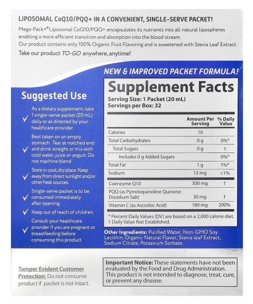 Mega-Pack+®Liposomal Technology®Dietary SupplementMulti PackSingle-Serve Liquid PacketsLiposomal CoQ10/PQQ+ In A Convenient, Single-Serve Packet! Mega-Pack+® Liposomal CoQ10/PQQ+ encapsulates its nutrients into all-natural lipospheres enabling a more efficient transition and absorption into the blood stream. Our product contains only 100% Organic Fruit Flavoring and is sweetened with Stevia Leaf Extract. Take our product To-Go anywhere, anytime!