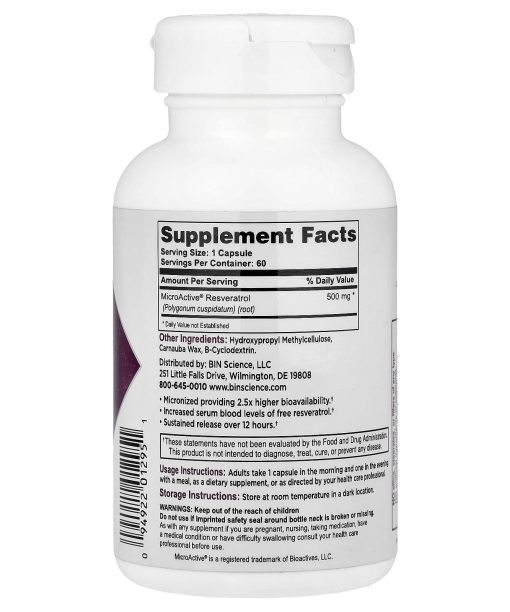 VeganGluten-FreeNon GMOSustained ReleaseDietary SupplementMicronized providing 2.5x higher bioavailability.Increased serum blood levels of free resveratrol. Sustained release over 12 hours.