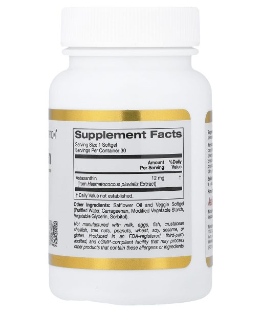 California Gold Nutrition® Astaxanthin, 12 mgFeaturing Astalif® Pure Icelandic AstaxanthinSourced from Microalgae Haematococcus pluvialisSupports Brain, Eye, Skin, Heart, and Joint Health*Biologically Active 99% (3S,3’S)-Isomer*Formulated without Gluten, GMOs, or Soy Produced in a 3rd Party Audited cGMP Registered (Certified) FacilityAstaxanthin is a fat-soluble antioxidant carotenoid found in the microalgae Haematococcus pluvialis. California Gold Nutrition® Astaxanthin contains this powerful antioxidant, which can help support brain, eye, skin, heart, and joint health.*Benefits of  Astalif® AstaxanthinOur supplement is formulated with Astalif® Pure Icelandic Astaxanthin. This is a preferred form of naturally-occurring astaxanthin known as a 3S, 3’S isomer and is considered biologically active because it can cross the blood-brain barrier.* Clinical studies have demonstrated that astaxanthin supports the brain, eyes, joints and cardiovascular system.* In addition, the free radical scavenging effect of this antioxidant can help to protect the skin from damage from the sun.*California Gold Nutrition Astaxanthin features premium quality Astalif® Pure Icelandic algae that is extracted by a solvent-free supercritical CO2 technology. When taken as directed, this provides a 1-month supply.iTested Verified