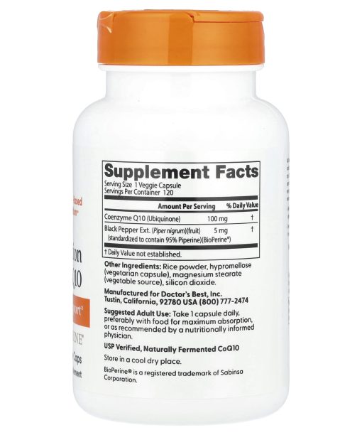 Science-Based Nutrition™Heart & Energy Support Dietary SupplementNaturally fermented CoQ10Non-GMOGluten FreeSoy FreeVegan At Doctor’s Best, we are all about tackling stress, free radicals, statin medications▵, and aging, which can zap CoQ10 levels and affect stamina. Our specialized formula is geared towards boosting energy production, supporting muscle function, and enhancing overall vitality. Helps restore CoQ10 that may be depleted by aging and statin drugs▵. Formulated with BioPerine® black pepper extract to enhance absorption and bioavailability.▵CoQ10 is not intended to serve as a replacement for statin therapy, nor should you discontinue taking any prescribed medications while supplementing with CoQ10.