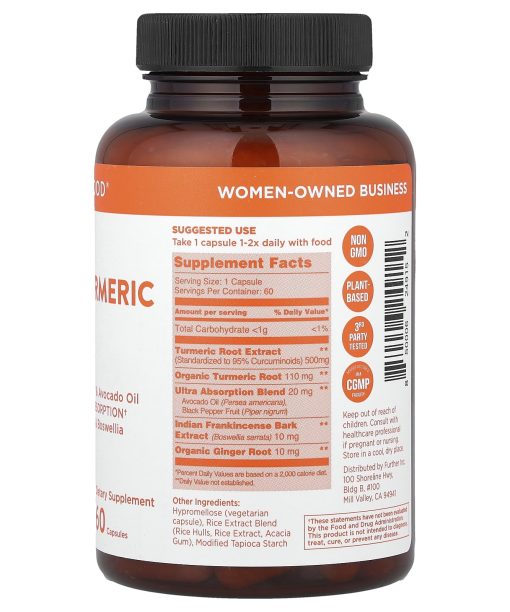 Black Pepper & Avocado Oil For Ultra Absorption Plus Ginger & Boswellia500 mg of 95% Curcuminoid Extract Per ServingDietary SupplementWomen-Owned BusinessNon GMOPlant-Based3rd Party TestedManufactured in a cGMP FacilityFurther Your Wellness™We Take Turmeric FurtherTurmeric is a cornerstone of Ayurvedic medicine and has been used for centuries for whole body wellness.Our herbalists combined Curcumin, the active ingredient in Turmeric, with Turmeric Root, Ginger, and Boswellia to maximize full body and joint comfort. We also added bioavailability boosters-avocado oil and black pepper-to create the first ever Ultra Absorption formula so you get more from every capsule.Helps SupportJoint Flexibility