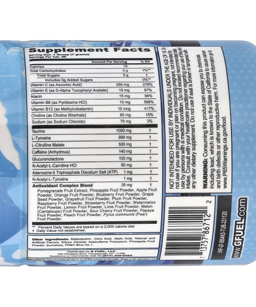 Sugar FreeNaturally and Artificially Flavored15 CaloriesEnergyFocusEnduranceReactionDietary SupplementAs one of the three OG G FUEL flavors, Blue Ice, much like fine wine, has only gotten better with age! This flavor tastes reminiscent of those blue slushie drinks you’d grab at the corner store – Simply delicious!Great TasteThe #1 thing our customers mention about GFUEL is the taste.Zero SugarEnjoy the energy, avoid the sugar crash.Vitamin RichPacked with vitamins plus a balanced mix of antioxidants.Boosts FocusFocus aminos provide a unique edge to stay mentally sharp.Natural StimulantCaffeine levels give your mind a quick jump start.