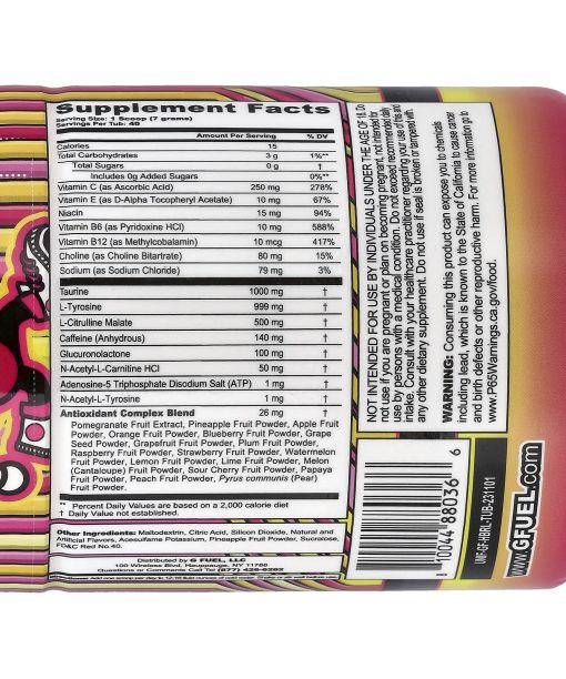 Sugar Free15 CaloriesNaturally and Artificially FlavoredEnergyFocusEnduranceReactionDietary SupplementGreat TasteThe #1 thing our customers mention about GFUEL is the taste.Zero SugarEnjoy the energy, avoid the sugar crash.Vitamin RichPacked with vitamins plus a balanced mix of antioxidants.Boosts FocusFocus aminos provide a unique edge to stay mentally sharp.Natural StimulantCaffeine levels give your mind a quick jump start.