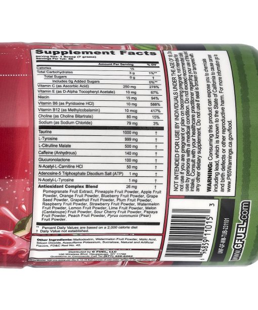 Sugar Free15 CaloriesNaturally and Artificially FlavoredEnergyFocusEnduranceReactionDietary SupplementThe quintessential fruit of summer! The timeless taste! The iconic combination of juicy, watery, sweet, yet subtle fruity notes! This is of course – Watermelon G FUEL! And it’s been completely revamped AND reskinned for 2020! WATER-MALONEEEEE!!!Great TasteThe #1 thing our customers mention about GFUEL is the taste.Zero SugarEnjoy the energy, avoid the sugar crash.Vitamin RichPacked with vitamins plus a balanced mix of antioxidants.Boosts FocusFocus aminos provide a unique edge to stay mentally sharp.Natural StimulantCaffeine levels give your mind a quick jump start.