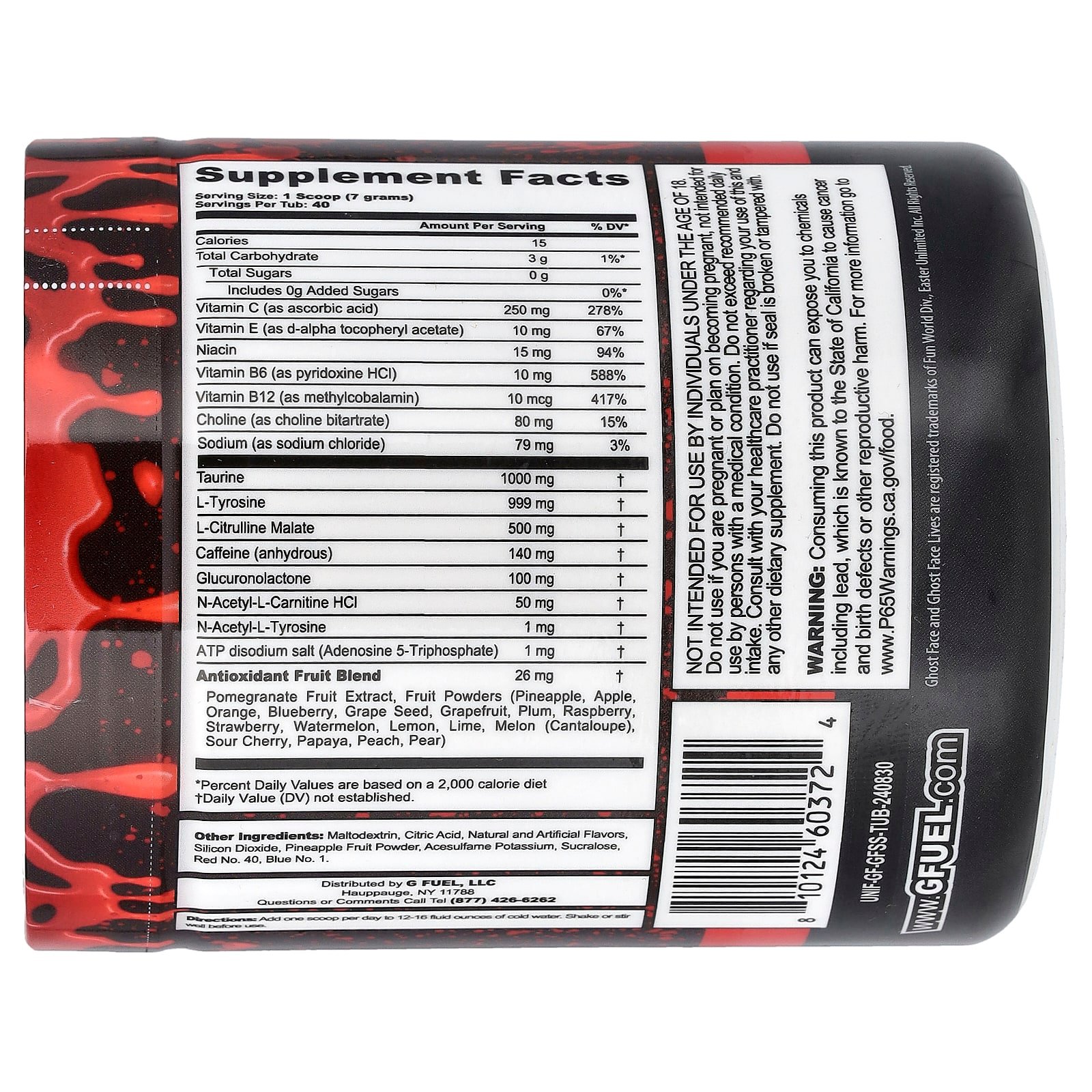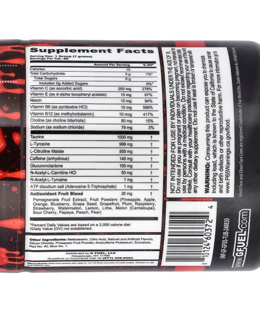 Sugar FreeNaturally and Artificially FlavoredEnergyFocusEnduranceReactionDietary SupplementGhost Face Lives®Fuel The Face of Fear™ and dive into the chilling thrill of a horror Classic with G FUEL’s “Stab Stimulant Energy Formula” – Inspired by the Iconic Ghost Face®. This killer 40 Serving Energy Tub brings spine-tingling excitement to your taste buds, combining a deliciously dark twist of Cherry + Green Apple. With every scoop of Energy + Focus, you’re not only fueling your day but also paying homage to the thrill of the hunt, the fear of the unknown, and the exhilaration of the chase. Whether you’re a long-time horror aficionado, a G FUEL enthusiast, or a gamer seeking an edge in an intense session, this flavor is sure to send shivers down your spine to ignite your senses!