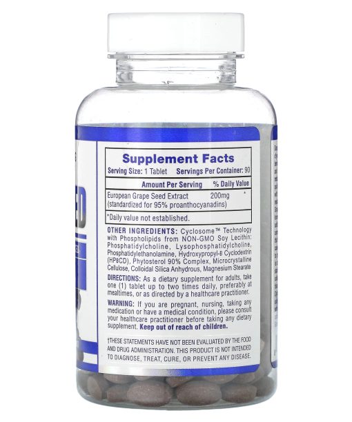 Cyclosome Delivery™ For Enhanced Bioavailability200 mg Per Tablet95% OPC European SourcedCirculatory & Blood Sugar SupportSourced From a GMP Certified Facility – Quality Assured Non-GMODietary SupplementGrape seeds have been used traditionally for thousands of years in Europe and studied for their powerful antioxidant benefits, including phenolic acids, anthocyanins, flavonoids and oligomeric proanthocyanidins (OPC’s) or plant metabolites. Hi-Tech Pharmaceuticals uses the highest quality full-spectrum European grape seed extract with 95% OPC’s including additional healthy plant metabolites for a more synergistic formula. Hi-Tech’s Grape Seed Extract naturally contains polyphenols known as oligomeric proanthocyanidins (OPCs). In addition to being cardio protective, proanthocyanidin compounds possess the powerful antioxidant properties that help fight cell-damaging free radicals which can cause oxidative stress in the body, and in turn contribute to premature aging of cells. Our Grape Seed extract is carefully tested and produced to certified quality standards. It has also been shown to protect & strengthen collagen, a key component for healthy skin, connective tissue and vascular walls. Our scientifically advanced Cyclosome™ technology sets our ingredients apart using natural liposomes to protect the grape seed extract through digestion and a starch cyclodextrin for optimal absorption. Introducing the most bioavailable Grape Seed Extract on the Market.