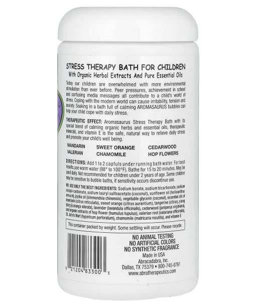 Organic HerbsNo animal testingNo artificial colorsNo synthetic fragranceStress Therapy Bath for ChildrenWith Organic Herbal Extracts and Pure Essential OilsToday our children are overwhelmed with more environmental stimulation than ever before. Peer pressures, achievement in school and confusing media messages all contribute to a child’s world of stress. Coping with the modern world can cause irritability, tension and anxiety. Soaking in a bath full of calming AROMASAURUS bubbles can help your child cope with daily stress.Therapeutic Effect: Aromasaurus Stress therapy Bath with its special blend of calming organic herbs and essential oils, therapeutic minerals, and vitamin E is the safe, natural way to relieve daily stress and promote your child’s well being.Mandarin – Sweet Orange – Cedarwood – Valerian – Chamomile – Hop Flowers