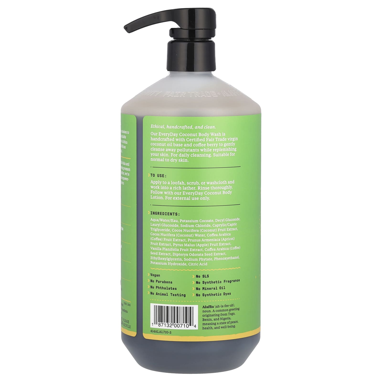 Virgin Coconut Oil Beauty • Equality • Empowerment  Traditional Authentic West African Natural IngredientsFair Trade / Cruelty-Free Plant-Based Ingredients Made With Love And Respect VeganNo Parabens No Phthalates No Animal Testing No SLS No Synthetic Fragrance No Mineral Oil No Synthetic Dyes Ethical, handcrafted, and clean.Our EveryDay Coconut Body Wash is handcrafted with Certified Fair Trade virgin coconut oil base and coffee berry to gently cleanse away pollutants while replenishing your skin. For daily cleansing. Suitable for normal to dry skin.