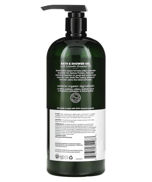 Gently Cleanses and Restores Even Extra Dry SkinNSF CertifiedNo GMOsVeganBiodegradableSulfate FreeDeep Rooted Beauty CareHain CelestialLeaping Bunny CertifiedCruelty FreeBath & Shower Gel with Lavender Essential OilGentle plant-based formula unites Lavender Essential Oil, Quinoa Protein, Aloe and botanical cleansers to purify and nourish even extra dry skin, while the soothing aroma of lavender calms the mind and body.Contains Organic IngredientsNo GMOs, parabens, sulfates, synthetic colors or fragrances, phthalates, or animal testing. Certified by QAI to NSF/ANSI 305, The American National Standard for personal care products containing organic ingredients.