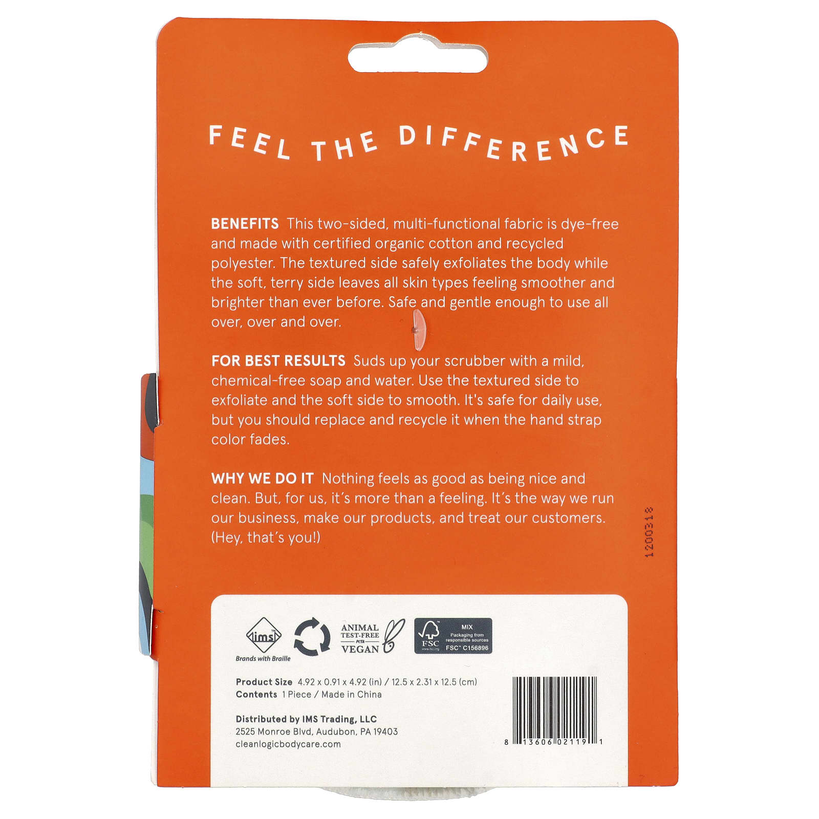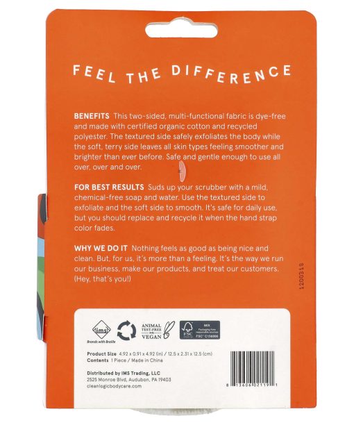 SustainableDouble Duty For Maximum BeautyCertified Organic CottonBrands With Braille Animal Test-Free; PETA; Vegan Product Size: 4.92 x 0.91 x 4.92 (in) / 12.5 x 2.31 x 12.5 (cm)Feel The DifferenceBenefits: This two-sided, multi-functional fabric is dye-free and made with certified organic cotton and recycled polyester. The textured side safely exfoliates the body while the soft, terry side leaves all skin types feeling smoother and brighter than ever before. Safe and gentle enough to use all over, over and over. Why we do it: Nothing feels as good as being nice and clean. But, for us, it’s more than a feeling. It’s the way we run our business, make our products, and treat our customers. (Hey, that’s you!)