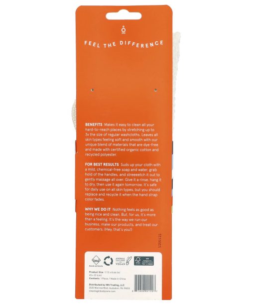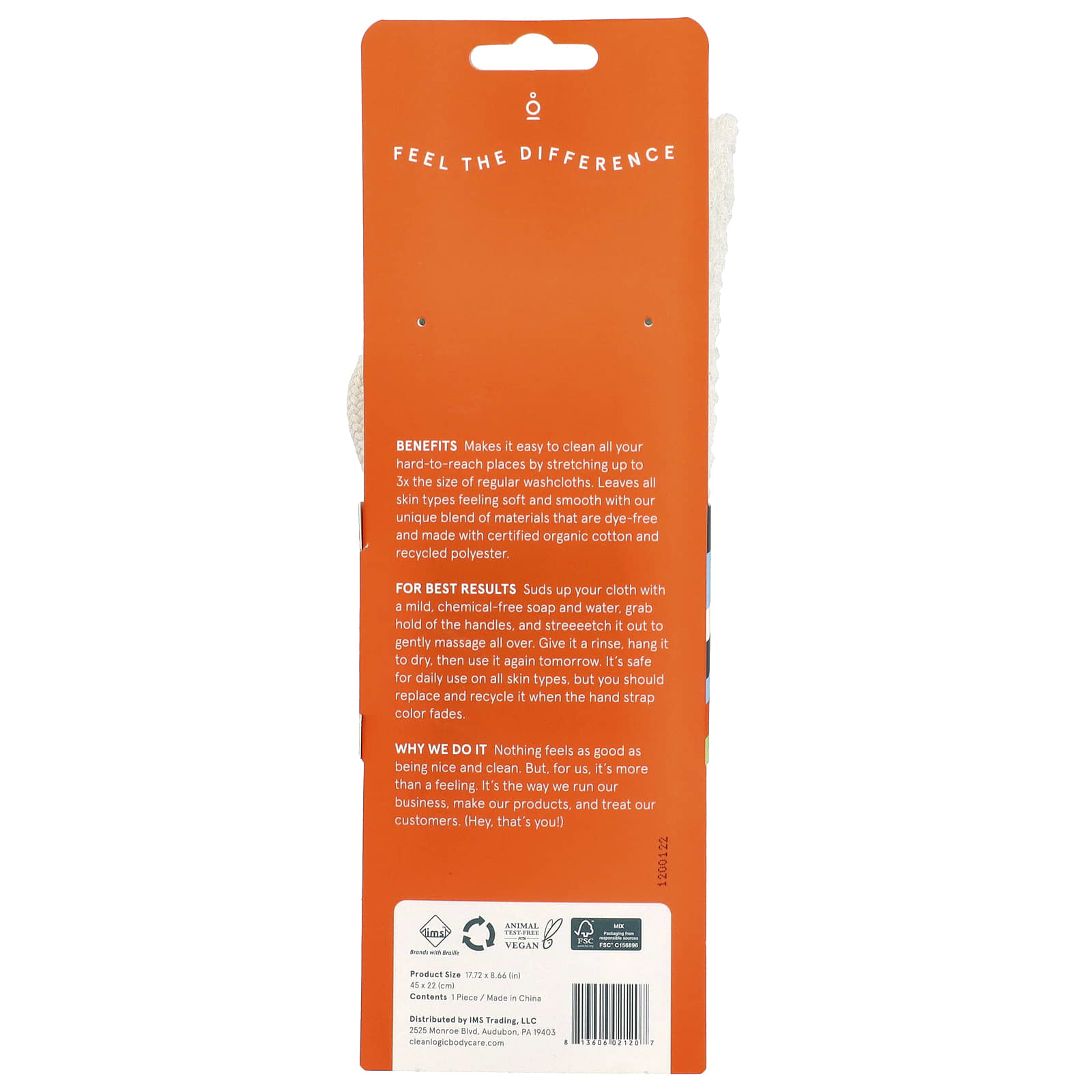 SustainableWe’ve Got Clean CoveredCertified Organic Cotton Feel The Difference Product Size: 17.72 x 8.66 (in) 45 x 22 (cm)Animal Test-Free; PETA; Vegan Brands with Braille Benefits: Makes it easy to clean all your hard-to-reach places by stretching up to 3x the size of regular washcloths. Leaves all skin types feeling soft and smooth with our unique blend of materials that are dye-free and made with certified organic cotton and recycled polyester. Why we do it: Nothing feels as good as being nice and clean. But, for us, it’s more than a feeling. It’s the way we run our business, make our products, and treat our customers. (Hey, that’s you!)