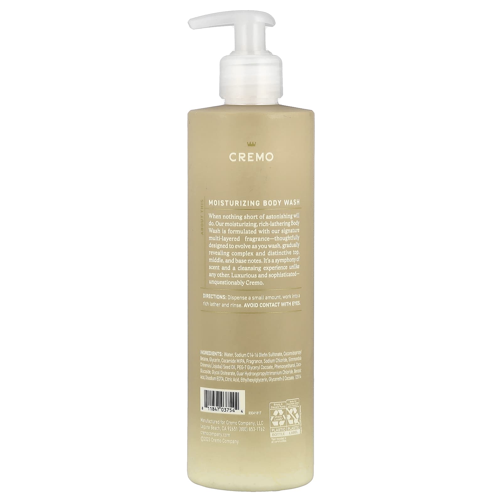 With Scent Note of White Jasmine, Red Currant, Sweet AmberSLS/SLES FreeOur rich, skin-moisturizing formula with multi-layered fragrance that evolves as you wash. Moisturizing Body Wash When nothing short of astonishing will do. Our moisturizing, rich-lathering Body Wash is formulated with our signature multi-layered fragrance-thoughtfully designed to evolve as you wash, gradually revealing complex and distinctive top, middle, and base notes. It’s a symphony of scent and a cleansing experience unlike any other. Luxurious and sophisticated- unquestionably Cremo.