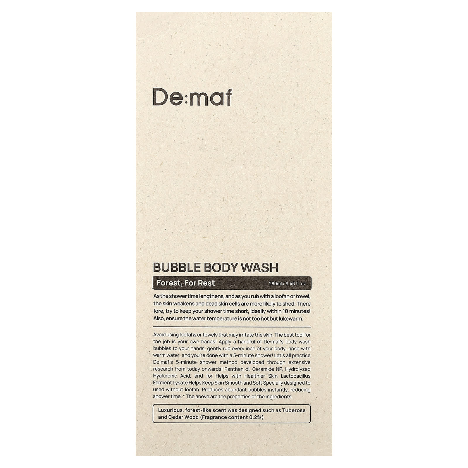 Free of Bleaching ChemicalsEarth PactNo Frills, Only 33 IngredientsFor All Skin TypesLuxurious, forest-like scent was designed such as Tuberose and Cedar Wood (Fragrance content 0.2%).As the shower time lengthens, and as you rub with a loofah or towel, the skin weakens and dead skin cells are more likely to shed. Therefore, try to keep your shower time short, ideally within 10 minutes! Also, ensure the water temperature is not too hot but lukewarm. Panthenol, ceramide NP, hydrolyzed hyaluronic acid, and for helps with healthier skin lactobacillus ferment lysate helps keep skin smooth and soft specially designed to used without loofah. Produces abundant bubbles instantly, reducing shower time. *The above are the properties of the ingredients.