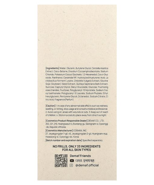 Water, glycerin, butylene glycol, centella asiatica extract, coco-betaine, disodium cocoamphodiacetate, sodium chloride, potassium cocoyl glycinate, 1,2-hexanediol, coco-glucoside, panthenol, ceramide np, hydrolyzed hyaluronic acid, lactobacillus ferment lysate, chlorella vulgaris extract, glycine soja (soybean) seed extract, quillaja saponaria bark extract, sucrose, caprylyl glycol, decyl glucoside, glucose, fructoolig osaccharides, fructose, polyglyceryl-10 myristate, sodium cocoyl isethionate, polyglyceryl-10 laurate, sodium phytate, ethylhexylglycerin, pentylene glycol, octanediol, sodium citrate, citric acid, fragrance (parfum).