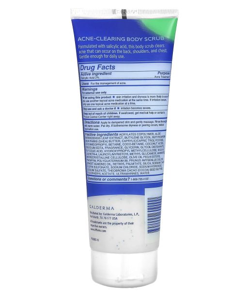 Cleanse2% Salicylic Acid Acne Treatment When used daily, helps clear body breakouts. Contains Glycolic acid to gently exfoliate and smooth. Vitamin E to nourish and soothe skinFormulated with salicylic acid, this body scrub clears acne that can occur on the back, shoulders, and chest. Gentle enough for daily use.Uses: For the management of acne.