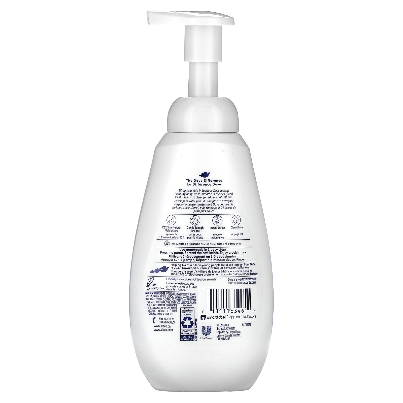 24h of SoftnessBeauty MoistureImproved Lather100% Skin-Natural MoisturizersGentle Enough for FaceInstant LatherClean RinseNo Sulfates or ParabensPeta; Cruelty-FreeGlobally, Dove Does Not Test on AnimalsThe Dove DifferenceWrap your skin in luscious Dove Instant Foaming Body Wash. Breathe in the rich, floral scent, then rinse clean for 24 hours of soft skin.