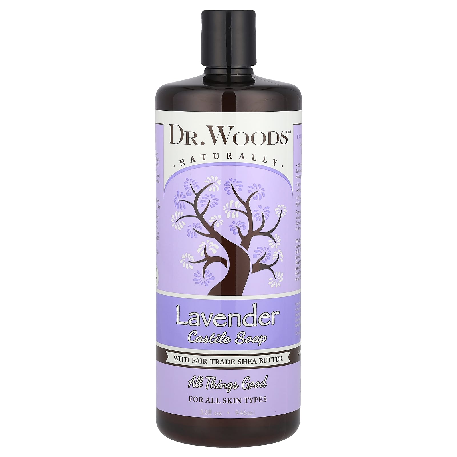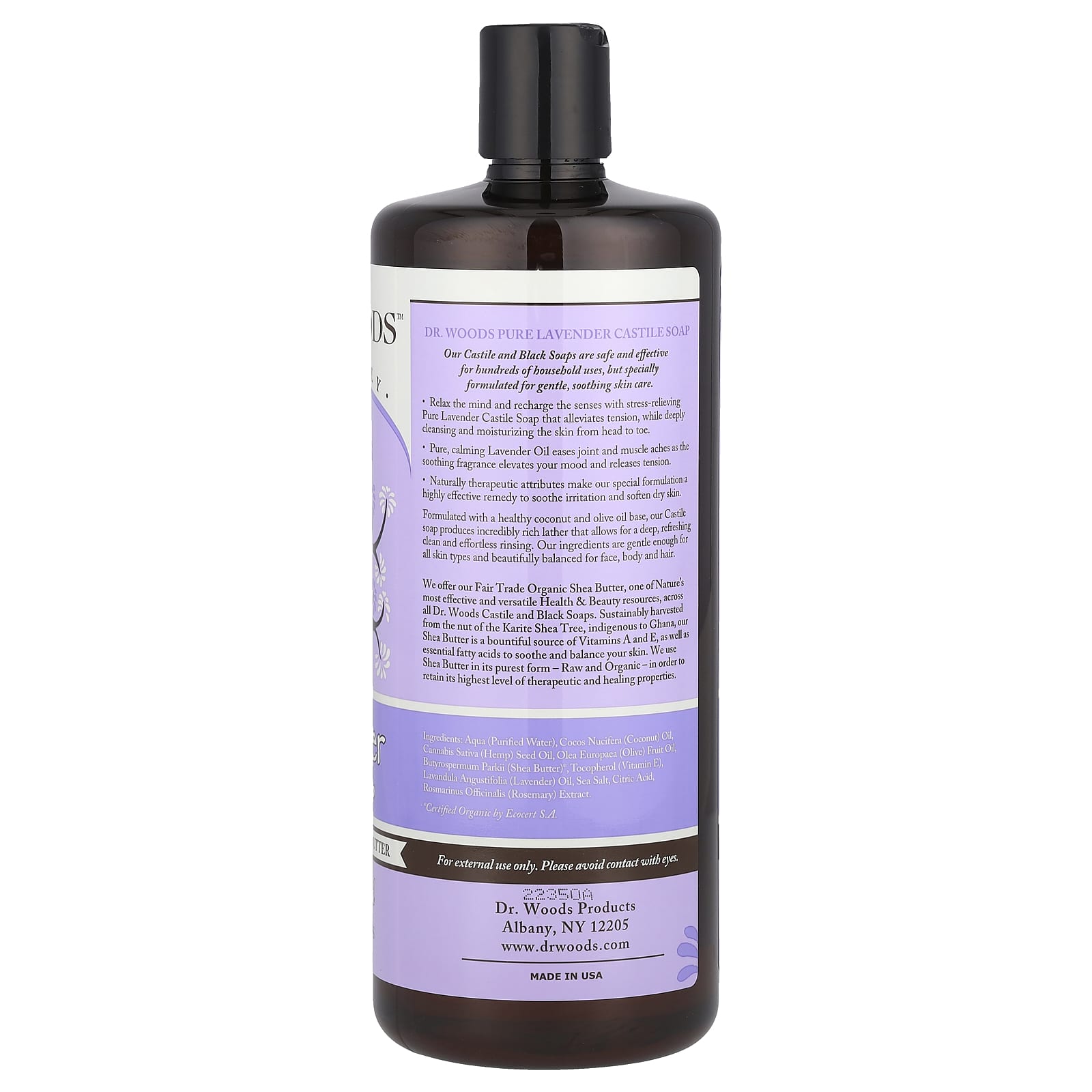 NaturallyAll Things GoodFor All Skin TypesMade With Fair Trade Shea ButterLeaping Bunny®; Cruelty Free100% Vegan & Gluten FreeParaben and Phthalate FreeLauryl/Laureth Sulfate FreeNo Petroleum DerivativesOur Castile and Black Soaps are safe and effective for hundreds of household uses, but specially formulated for gentle, soothing skin care.Relax the mind and recharge the senses with stress-relieving Pure Lavender Castile Soap that alleviates tension, while deeply cleansing and moisturizing the skin from head to toe.Pure, calming Lavender Oil eases joint and muscle aches as the soothing fragrance elevates your mood and releases tension.Naturally therapeutic attributes make our special formulation a highly effective remedy to soothe irritation and soften dry skin.Formulated with a healthy coconut and olive oil base, our Castile soap produces incredibly rich lather that allows for a deep, refreshing clean and effortless rinsing. Our ingredients are gentle enough for all skin types and beautifully balanced for face, body and hair.We offer our Fair Trade Organic Shea Butter, one of Nature’s most effective and versatile Health & Beauty resources, across all Dr. Woods Castile and Black Soaps. Sustainably harvested from the nut of the Karite Shea Tree, indigenous to Ghana, our Shea Butter is a bountiful source of Vitamins A and E, as well as essential fatty acids to soothe and balance your skin. We use Shea Butter in its purest form – Raw and Organic – in order to retain its highest level of therapeutic and healing properties.All Things Good For Our Family… And Yours.Dr. Woods is a family business born from our own passionate quest to produce the finest and most effective Health & Beauty products in the world. Our family is wonderfully diverse with different ages, skin types, hair textures and styling needs, so creating truly healthy, highly effective products that work for all of us was an inspiring challenge… and with diligence, creativity and lots of love, we created the most beneficial and environmentally sustainable products available.Dr. Woods draws on the very best time-tested healing traditions together with modern formulation processes. We choose to keep our products as natural as possible, without compromising effectiveness, using the best pure ingredients from around the world and never containing dangerous chemical additives or harsh detergents that strip away your skin’s natural elasticity. We’ve also worked incredibly hard to make our products truly affordable so good health and exceptional quality are accessible to everyone.Our family is deeply proud of the products we make and it is a great honor to share them with yours.