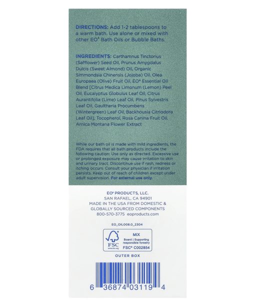 Add 1-2 tablespoons to a warm bath. Use alone or mixed with other EO® Bath Oils or Bubble Baths.