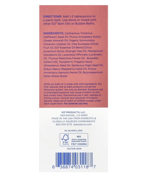 Add 1-2 tablespoons to a warm bath. Use alone or mixed with other EO® Bath Oils or Bubble Baths.