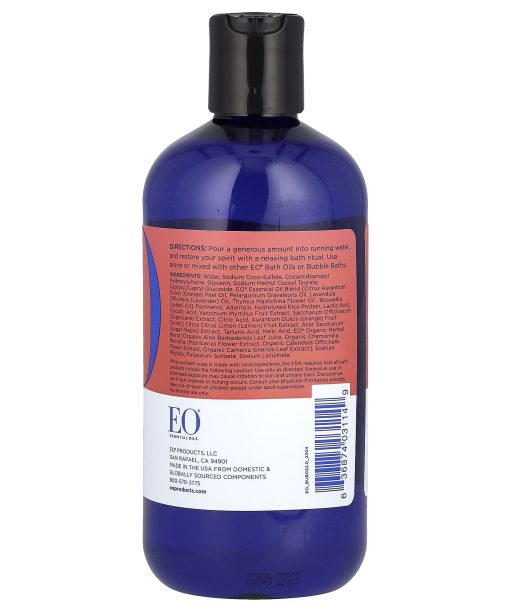 Water, sodium coco-sulfate, cocamidopropyl hydroxysultaine, glycerin, sodium methyl cocoyl taurate, caprylyl/capryl glucoside, eo® essential oil blend [citrus aurantium dulcis (orange) peel oil, pelargonium graveleons oil, lavandula officinalis (lavender) oil, thymus mastichina flower oil , boswellia carterii oil], panthenol, allantoin, hydrolyzed rice protein, lactic acid, glycolic acid, vaccinium myrtillus fruit extract, saccharum officinarum (sugarcane) extract, citric acid, aurantium dulcis (orange) fruit extract, citrus citrus limon (lemon) fruit extract, acer saccharum (sugar maple) extract, tartaric acid, malic acid, eo® organic herbal blend [organic aloe barbadensis leaf juice, organic chamomilla recutita (matricaria) flower extract, organic calendula officinalis flower extract, organic camellia sinensis leaf extract], sodium phytate, potassium sorbate, sodium levulinate.