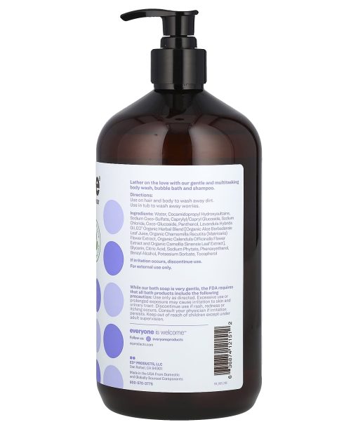 For Every Body Nourishing + MultitaskingBody Wash, Bubble Bath, ShampooMade with PlantsPure Essential OilsWith Calendula, Chamomile and Aloe VeraCertified B CorporationLeaping Bunny®; Cruelty-FreeEWG Verified For Your Healtheveryone is welcome™Real good stuff inside! We say NOPE to fake fragrances, dyes and fillers. And YEP to quality ingredients and plant extracts that are vegan and cruelty free. Why? Because we believe in making good products that everyone can enjoy. For us, that’s botanical body care that’s better for you and for the planet.Smells like real lavender and aloe vera (because it is!)Nope!No animal testingNo parabens, dyes, phthalatesNo synthetic fragranceNo sketchy fillersNo harsh chemicalsNo worries!Yep!Hypoallergenic + dermatologist testedPlant extracts + pure essential oilsZero-waste manufacturing100% recycled bottleFamily-ownedMade with love!Lather on the love with our gentle and multitasking body wash, shampoo and bubble bath.