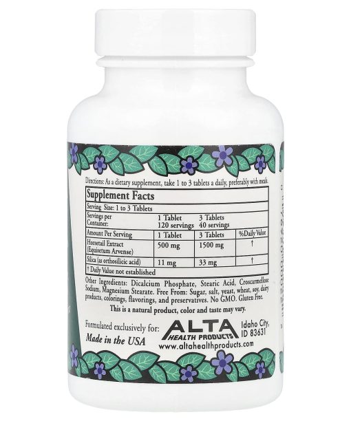 The Natural Nutrient for Hair, Bones and NailsA Dietary SupplementNo GMO Gluten FreeSilica strengthens and supports healthy skin, hair, bones and nails. Using the finest quality Horsetail Extract with bioflavonoids, Alta Health Silica provides the pure ortho form of soluble/colloidal Silica by means of special extraction process. Silica is an essential trace mineral that plays a biological role in the processes by which bone, cartilage, connective tissue and skin are formed, and is a component of collagen. Alta’s Herbal Silica provides the best absorption and assimilation.