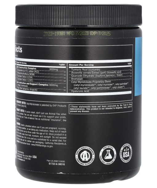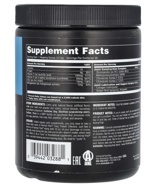 Comprehensive Joint SupportPlus Collagen Peptides Type I and IILubricates Joints for Comfort & Smoother MovementSuperior AbsorptionSupports Healthy Cartilage for Better Shock Absorption & Joint ProtectionDietary SupplementIronclan Quality & Guarantee – Commitment to ExcellenceEvery Batch is Third Party Laboratory TestedProduct Notes: If you’re smart, don’t just use Animal Flex when you got a problem. You can and should use to help prevent problems from arising in the first place. Think of Animal Flex as nutritional “insurance”, like Animal Pak. Animal Flex, the award-winning joint support supplement, helps repair, protect, and maintain joint health and function in a great tasting powder. Animal Flex rebuilds and lubricates joints with Glucosamine, Chondroitin, MSM, and a full complex of joint health ingredients.