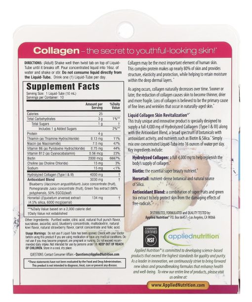 Fight the Effects of AgingSupports Healthy Skin HydrationType 1 & 3 Hydrolyzed CollagenConcentrated Drink Mix!Dietary SupplementNSF Contents CertifiedIntensive Nourishment for Skin, Hair & Nails with:Collagen (4,000 mg)Biotin (2,000 mcg)Silica (6,000 mcg)Only 25 Calories per ServingCollagen – the secret to youthful-looking skin!Collagen may be the most important element of human skin. This complex protein makes up nearly 80% of skin and provides structure, elasticity and protection, while helping to retain moisture within the deep dermal layers.As aging occurs, collagen naturally decreases over time. Sooner or later, the reduction of collagen causes skin to become thinner, drier and more fragile. Loss of collagen is believed to be the primary cause of fine lines and wrinkles that occur in naturally-aged skin.Liquid Collagen Skin Revitalization®This truly unique and innovative product is specially designed to supply a full 4,000 mg of hydrolyzed collagen (type I & III) along with the Antioxidant Blend, a broad spectrum of botanicals with antioxidant activity, and nutrients such as Biotin & Silica. Simply mix one concentrated Liquid-Tube into 16 ounces of water per day. Key ingredients include:Hydrolyzed Collagen: a full 4,000 mg to help replenish the body’s supply of collagen.Biotin: the essential super beauty nutrient.Horsetail: nutrient-dense botanical and natural source of silica.Antioxidant Blend: a combination of super fruits and green tea extract to help protect skin from the damaging effects of free-radicals.Applied Nutrition® is committed to developing science-based products that exceed the highest standards for quality and purity. As a leader in innovation, we continuously strive to bring forward new ideas and groundbreaking formulas that enhance health and well-being.