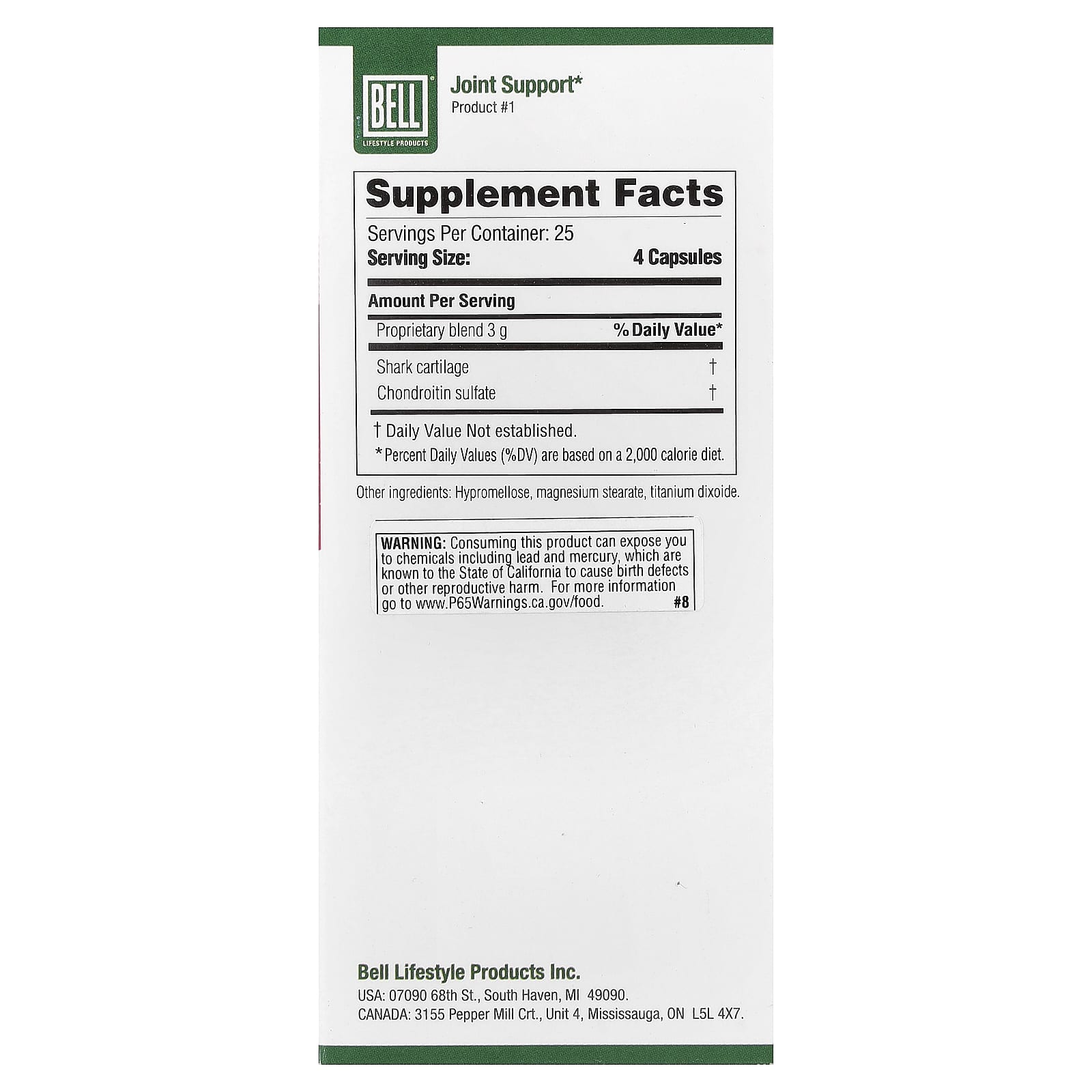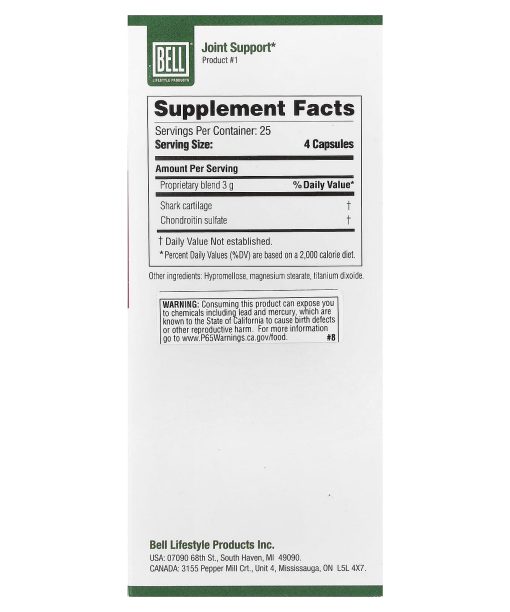 Keep out of reach of children. Consult a physician prior to use if you are pregnant or nursing. Consult a physician prior to use if you have a kidney disorder, liver disorder, heart condition, circulatory condition, or if you are recovering from surgery. If an allergic reaction to any of the ingredients occurs, discontinue use and consult a physician. Consult a physician prior to use if you are taking prescription medication(s). Do not use if seal is broken. Our shark cartilage is a responsibly sourced by-product of the food industry.Consuming this product can expose you to chemicals including lead and mercury, which is known to the State of California to cause birth defects or other reproductive harm. Prop 65.Store in a cool dry place.
