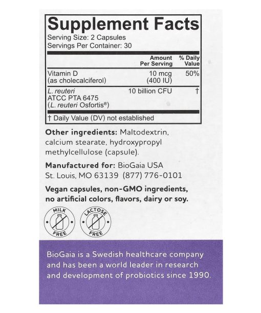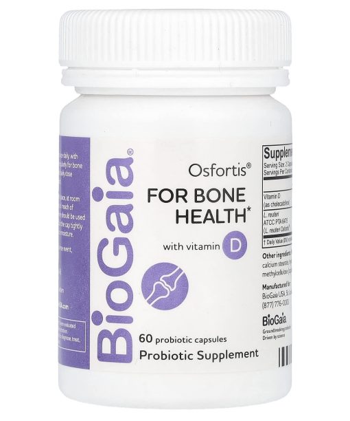 For Bone HealthClinically ProvenProbiotic SupplementGroundbreaking Probiotics Driven by ScienceCountry of Origin: SpainMilk FreeLactose FreeProbiotic capsules with vitamin D3 BioGaia® Osfortis® is a dietary supplement containing the patented probiotic Limosilactobacillus reuteri Osfortis R (L. reuteri ATCC PTA 6475) and vitamin D3. Vitamin D contributes to the maintenance of normal bones.Because L. reuteri Osfortis naturally colonizes humans it has a strong adaptation to persist and interact with humans. L. reuteri Osfortis has been tested in clinical trials and proven effective and safe.BioGaia is a Swedish healthcare company and has been a world leader in research and development of probiotics since 1990.