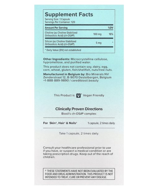 2 in 1 Generates & Protects Your Own CollagenThickens & Strengthens HairReduces Fine Lines & Wrinkles SkinStrengthens NailsClinically Proven Dietary Supplement100% Vegan FriendlyPatented ch-OSA® ComplexThis Product is Vegan FriendlyFree From Animal CollagenGluten FreeDairy & Soy FreeNon GMO Project VerifiedBeautiful results take time: 1-3 Months: Stronger nails, fuller, shining hair, and glowing skin. 4-6 Months: Improved wrinkles, fine lines, and skin elasticity.7+ Months: Peak results for stronger, thicker hair.Clinically Proven More skin elasticity.‡*Reduction in fine lines & wrinkles.‡* Stronger & thicker hair.‡*Stronger, smoother nails.‡*For results you can see, feel, and show. ‡Clinical trial results versus placebo. *Results may vary. Don’t take collagen. Make your own. Our 2 IN 1 formula Biosil is different; it doesn’t contain collagen. Instead, it’s clinically proven to activate your cells into making more of your own collagen – the best, most powerful collagen for you.And that’s not all. It also protects the collagen you already have. That’s our unique 2-in-1 formula.