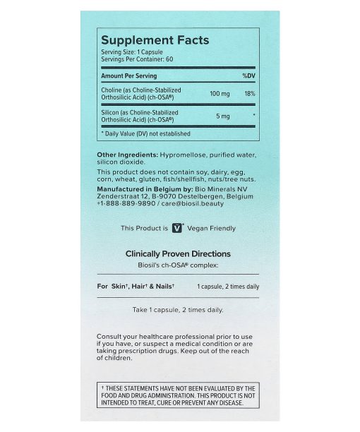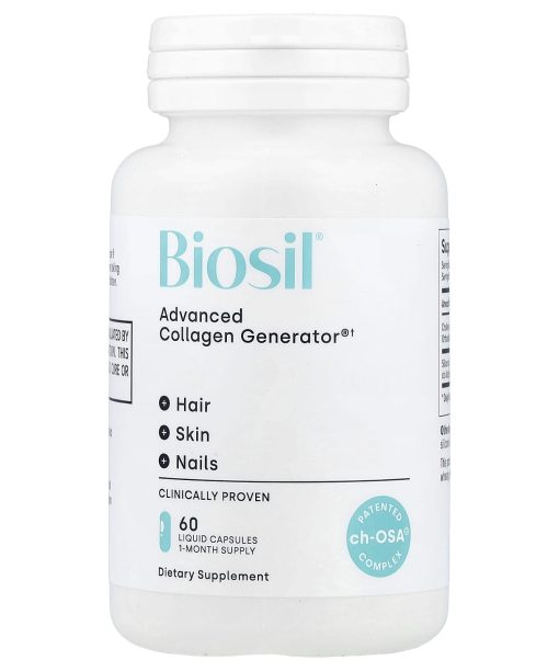 Clinically Proven Patended ch-OSA® Complex 2 in 1 – Generates & Protects Your Own CollagenThickens & Strengthens HairReduces Fine Lines & WrinklesStrengthens Nails 100% Vegan FriendlyFree From Animal CollagenGluten FreeDairy & Soy Free Non GMO Project Verified For Skin, Hair & NailsDon’t take collagen. Make your own. Our 2 in 1 formula Biosil is different; it doesn’t contain collagen. Instead, it’s clinically proven to activate your cells into making more of your own collagen – the best, most powerful collagen for you. And that’s not all. It also protects the collagen you already have. That’s our unique 2-in-1 formula.+Beautiful results take time:1-3 months: Stronger nails, fuller, shining hair, and glowing skin*4-6 months: Improved wrinkles, fine lines, and skin elasticity*7+ Months: Peak results for stronger, thicker hair*Clinically ProvenMore skin elasticity ‡*Reduction in fine lines & wrinkles ‡*Stronger & thicker hair ‡*Stronger, smoother nails ‡*For results you can see, feel, and show  ‡Clinical trial results versus placebo*Results may vary
