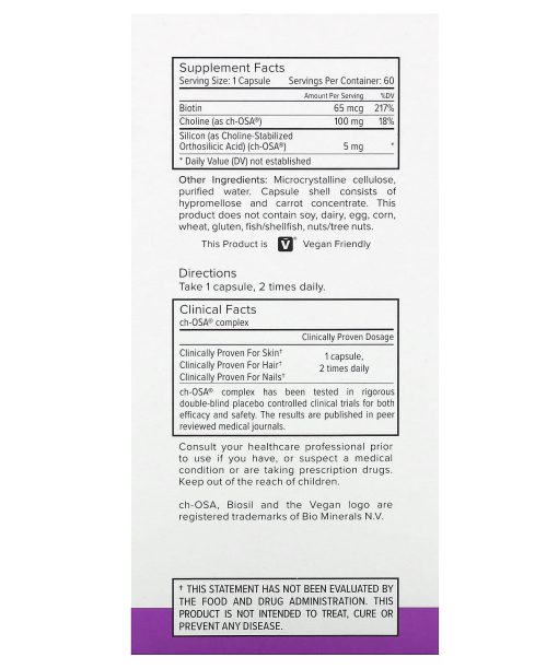 Clinically ProvenCh-OSA®+ BiotinGenerates & Protects You Own CollagenVegan Friendly SupplementGluten & Allergen FreeGMO FreeSoy FreeDairy FreeVegan Friendly2 IN 1 Generate + Protect BioSil’s CH-OSA© Complex activates your natural ability to generate and protect your own collagen, elastin, and keratin. This improves and supports your hair, skin, nails. Biotin enhances the benefits of the CH-OSA© complex – especially keratin production for thick, lustrous hair & strong nails.Grow, Strengthen, Thicken Added biotin takes your hair + nails to a new level. Biotin is an essential nutrient that supports healthy metabolism (vital for healthy hair and nails). CH-OSA© complex helps link keratin fibers together for stronger hair and nails. Together they form a powerful combination for more & thicker hair, stronger nails, and healthy skin.