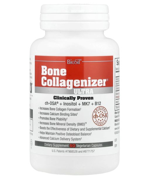 Clinically Provench-OSA® + Inositol + MK7 + B12Original ch-OSA® FormulaIncreases Bone Collagen FormationIncreases Calcium Binding SitesPromotes Bone PliabilityIncreases Bone Mineral Density (BMD)¥Boosts the Effectiveness of Dietary and Supplemental CalciumHelps Maintain Positive Osteoblast BalanceAdvanced Calcium Delivery SystemDietary SupplementSuitable for Vegetarians/VegansClinical Trial Results Results of double-blind, randomized, placebo-controlled clinical trials, with women who added Bone Collagenizer® to their daily supplements of 1000 mg of calcium and 800 IU of Vitamin D.Collagen’s Crucial Role in Your Total Bone Health The National Institutes of Health reports that it takes both calcium and collagen to build strong healthy bones. Collagen makes up 30% of your bone. Collagen serves as the “binding sites” for calcium and gives bone the pliability it needs to withstand physical stress. Age-related diminution of collagen leads to brittle bones and low BMD. The ch-OSA® in Collagenizer® ULTRA increases bone collagen formation and increases BMD. The choline and inositol help maintain “osteo-balance,” ensuring proper renewal of bone. The MK7 makes sure calcium gets delivered to the bone site. Vitamin B12 together with choline protects against collagen breakdown.¥¥Measured at the hip.
