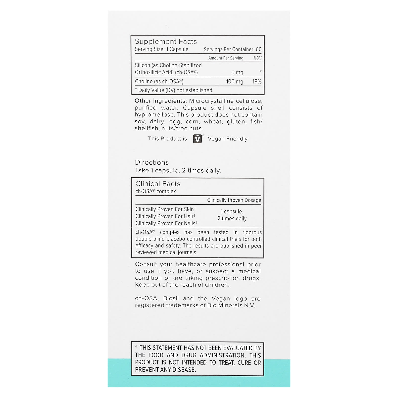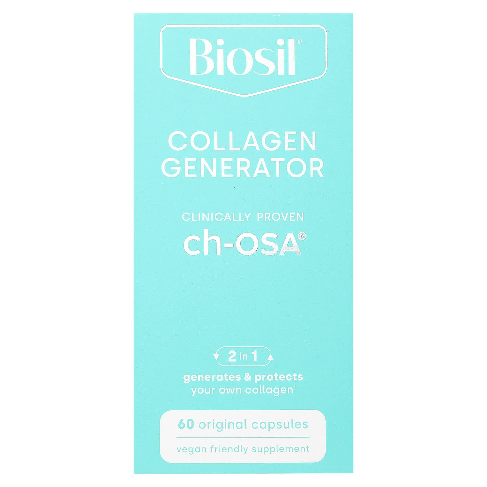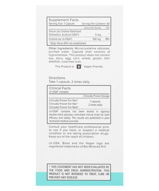 Clinically Proven ch-OSA®2 in 1 Generates & Protects Your Own CollagenVegan Friendly SupplementThis Product is V® Vegan FriendlyGluten & Allergen FreeGMO FreeSoy FreeDairy Free2 in 1 Generate + ProtectBioSil’s ch-OSA® complex activates your natural ability to generate and protect your own collagen, elastin, and keratin. This improves and supports your hair, skin, nails & joints. What’s more, ch-OSA® complex stimulates collagen with your DNA fingerprint. And that is truly unique.HAIR, SKIN, NAILSActivate your beautifying ability to generate & protect your own collagen. Improve your hair, skin, nails, and joints. Radiate with the self confidence of a glow you can see, feel & show.