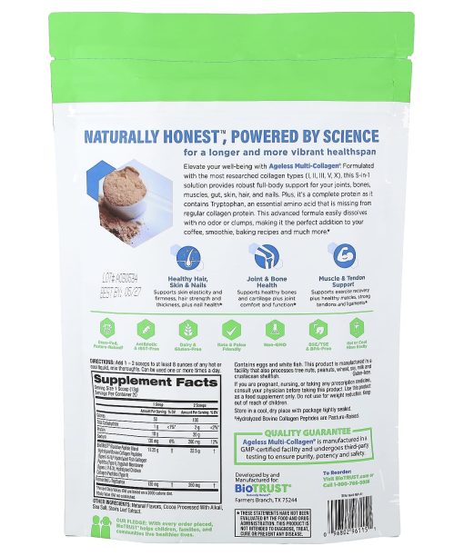 Non-GMONo Added HormonesNo Artificial SweetenersNaturally Honest™ Clean Ingredients22 g Bioactive Peptides Per 2 ScoopsGrass-Fed, Pasture-Raised‡5 Types of Collagen: I, II, III, V, XHealthy Hair, Skin & NailsJoint & Bone HealthMuscle & Tendon SupportFlavored with Other Natural FlavorsDietary SupplementAntibiotic & rBST-FreeDairy & Gluten FreeKeto & Paleo FriendlyBSE/TSE & BPA FreeHot or Cool Mixes EasilyNATURALLY HONEST™ Powered by Science for a longer and more vibrant healthspan Elevate your well-being with Ageless Multi-Collagen®. Formulated with the most researched collagen types (I, II, III, V, X), this 5-in-1 solution provides robust full-body support for your joints, bones, muscles, gut, skin, hair, and nails. Plus, it’s a complete protein as it contains Tryptophan, an essential amino acid that is missing from regular collagen protein. This advanced formula easily dissolves with no odor or clumps, making it the perfect addition to your coffee, smoothie, baking recipes and much more.Healthy Hair, Skin & Nails Supports skin elasticity and firmness, hair strength and thickness, plus nail health.Joint & Bone Health Supports healthy bones and cartilage plus joint comfort and function.Muscle & Tendon Support Supports exercise recovery plus healthy muscles, strong tendons and ligaments.Ageless Multi-Collagen® is manufactured in a GMP-certified facility and undergoes third-party testing to ensure purity, potency and safety.‡Hydrolyzed Bovine Collagen Peptides are Pasture-Raised.