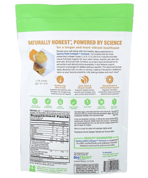 Non-GMONo Added Hormones or AntibioticsNo Artificial SweetenersNaturally Honest™Clean Ingredients22 g Bioactive Peptides Per 2 ScoopsOrganic Spice Blend5 Types of Collagen: I, II, III, V, XFlavored With Other Natural FlavorsDietary SupplementGrass-Fed, Pasture-Raised‡Antibiotic & rBST-FreeDairy & Gluten FreeKeto & Paleo FriendlyBSE/TSE & BPA FreeHot or Cool Mixes EasilyNaturally Honest™, Powered By Science for a longer and more vibrant healthspan Elevate your well-being with two healthy aging superheroes in Ageless Multi-Collagen® + Turmeric. Formulated with the most researched collagen types (I, II, III, V, X), this 5-in-1 solution provides robust full-body support for your joints, bones, muscles, gut, skin, hair, and nails. Enhanced with Turmeric, an ancient spice renowned for its antioxidant and detoxification properties, it also features organic cinnamon and ginger for added wellness benefits. This advanced formula easily dissolves with no odor or clumps, making it the perfect addition to spice up your favorite smoothie, milk, baking recipes and much more.Healthy Hair, Skin & Nails Supports skin elasticity and firmness, hair strength and thickness, plus nail healthJoint, Bone & Muscle Health Supports healthy bones, muscles and cartilage, plus joint comfort and functionDetoxification & Antioxidant Support Supports the body’s antioxidant status and normal detoxification pathwaysQuality GuaranteeAgeless Multi-Collagen® + Turmeric is manufactured in a GMP-certified facility and undergoes third-party testing to ensure purity, potency and safety. ‡Hydrolyzed Bovine Collagen Peptides are pasture-raised