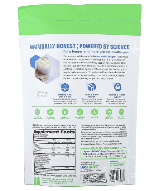 Non-GMONo Added HormonesNo Artificial SweetenersNaturally Honest™ Clean Ingredients22 g Bioactive Peptides Per 2 ScoopsGrass-Fed, Pasture-Raised‡5 Types of Collagen: I, II, III, V, XHealthy Hair, Skin & NailsJoint & Bone HealthMuscle & Tendon SupportFlavored with Other Natural FlavorsDietary SupplementAntibiotic & rBST-FreeDairy & Gluten FreeKeto & Paleo FriendlyBSE/TSE & BPA FreeHot or Cool Mixes EasilyNATURALLY HONEST™ Powered by Science for a longer and more vibrant healthspan Elevate your well-being with Ageless Multi-Collagen®. Formulated with the most researched collagen types (I, II, III, V, X), this 5-in-1 solution provides robust full-body support for your joints, bones, muscles, gut, skin, hair, and nails. Plus, it’s a complete protein as it contains Tryptophan, an essential amino acid that is missing from regular collagen protein. This advanced formula easily dissolves with no odor or clumps, making it the perfect addition to your coffee, smoothie, baking recipes and much more.Healthy Hair, Skin & Nails Supports skin elasticity and firmness, hair strength and thickness, plus nail health.Joint & Bone Health Supports healthy bones and cartilage plus joint comfort and function.Muscle & Tendon Support Supports exercise recovery plus healthy muscles, strong tendons and ligaments.Ageless Multi-Collagen® is manufactured in a GMP-certified facility and undergoes third-party testing to ensure purity, potency and safety.‡Hydrolyzed Bovine Collagen Peptides are Pasture-Raised.