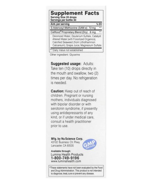 NuScience CorporationDietary SupplementGluten-Free FormulaGMP CertifiedContains One 1-Ounce Bottle and Educational BrochurePromotes mood and emotional well-being, joint support and liver health. A Superior Liquid SAM-e FormulationThe only SAM-e formula that contains Cellfood – the world’s No. 1 oxygen + nutrient supplement for 50 years, now available in more than 90 countries worldwide. Our liquid formulation provides greater cellular absorption than tablet or capsule forms. Cellfood Liquid SAM-e supports balanced mood and joint health and comfort. Helps promotes mood and emotional well-being, joint mobility + liver health. Cellfood SAM-e’s liquid formulation provides superior cellular absorption.